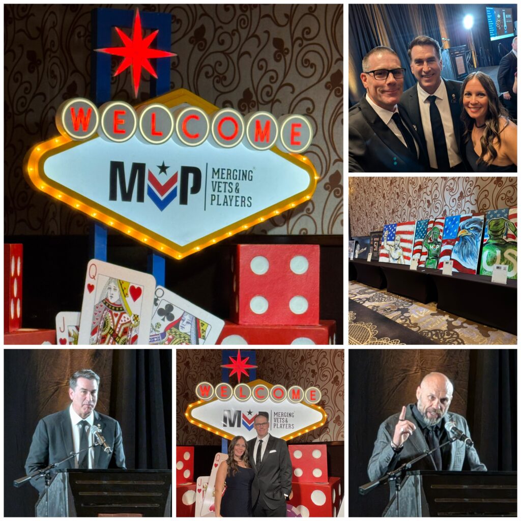 April 12, 2025, Bobbi & Chris had the privilege of representing Veterans Help Group as a guest at the 3rd Annual “Champions of Change” MVP Awards & Benefit Gala hosted by Merging Vets and Players in Las Vegas. We sponsored a table with the National Medal of Honor Center for Leadership. Rob Riggle-actor, comedian, and retired U.S. Marine officer- kept the room energized as the evenging’s emcee, while Randy Couture- firmer MMA fighter, actor, and U.S. Army sergeant- delivered a powerful and heartfelt keynote address.